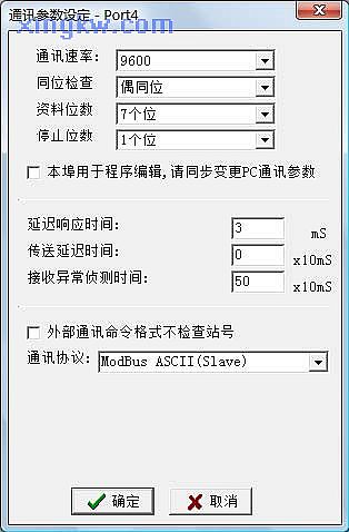【通訊口參數(shù)設(shè)定】 PLC通訊口的參數(shù)需要與伺服驅(qū)動器一致。點(diǎn)選菜單欄的“ PLC” ?“設(shè)定” ?“Port4通訊參數(shù)”,將參數(shù)設(shè)為“9600baud,偶同位 ,數(shù)據(jù)位7,停止位 1”,接收異常偵測時(shí)間設(shè)為 500ms,采用 ModBus ASCII(Slave)通訊協(xié)議。