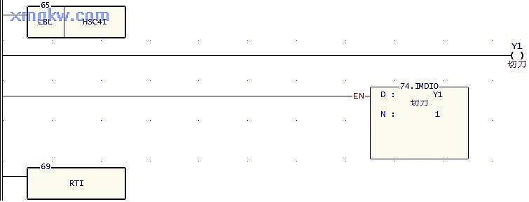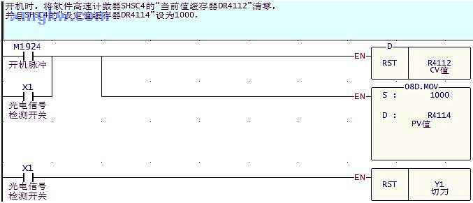 - SHSC4計(jì)數(shù)達(dá)到 1000時(shí)(即傳送帶滾軸轉(zhuǎn)動(dòng) 1000轉(zhuǎn)),以中斷的方式立即將 Y1的狀態(tài)輸出到外部輸出端,使切刀下切。