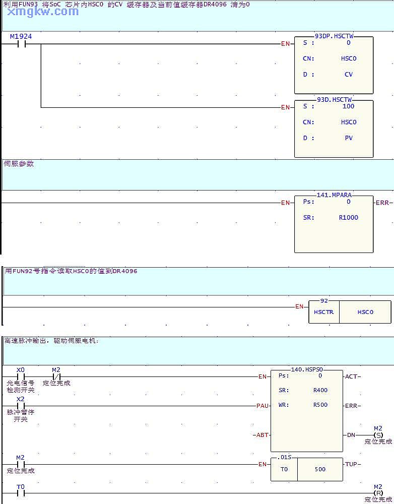 當(dāng)啟動開關(guān)閉合后, X1=ON,伺服電機開始以 0.1r/s(SPD=1000Hz)的速度開始旋轉(zhuǎn),經(jīng)過 200ms 的勻加速后,轉(zhuǎn)速增加到 1r/s(SPD=10000Hz),快到達目標(biāo)位置時,又以相同的方式作勻減速動作,到達目標(biāo)位置后,伺服電機停止運轉(zhuǎn)。
