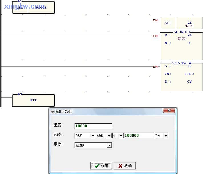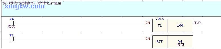 由于伺服電機每旋轉(zhuǎn)一周,接近開關(guān)會接收到 10個脈沖信號,當(dāng)伺服電機到達目標(biāo)位置時,接近開關(guān)會接收100個脈沖信號,產(chǎn)生中斷信號 “HSC0I”,執(zhí)行相應(yīng)的中斷程序,切刀執(zhí)行切割動作, 1 秒鐘后切刀返回,再過 3秒之后,伺服電機執(zhí)行下一次定位動作。