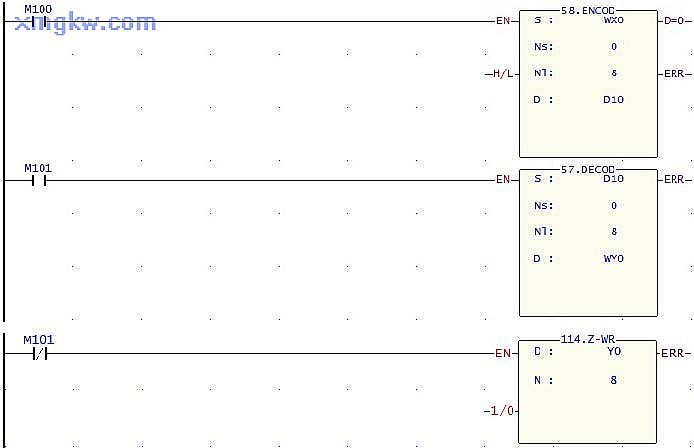 M101= ON,執(zhí)行 DECOD指令,設(shè)置 D10的值, D10的值會被譯碼到 Y0~Y7中之一,從而使對應(yīng)的輔助流水線暫停,例如, D0=5,則譯碼得到 Y5=ON,編號 5的輔助流水線將暫停運(yùn)行;當(dāng) M101=OFF, Z-WR指令執(zhí)行, Y0~Y7都為OFF,所有的流水線都正常運(yùn)行。