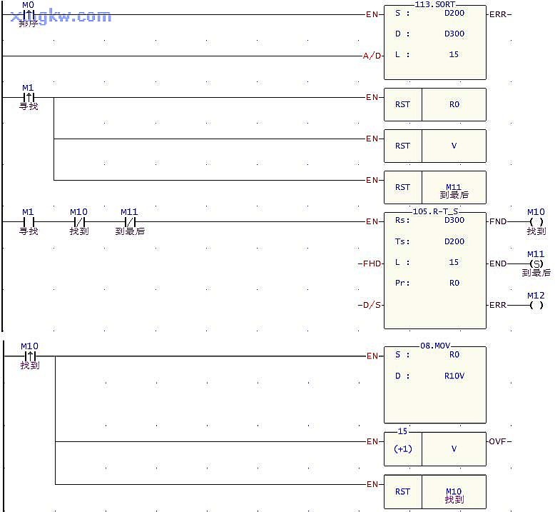 1.排序命令按鈕 M0由OFF→ON,即對存儲在 D200~D214的15個數(shù)據(jù)進行由小到大的排序,將結果存放到 D300~D314中。