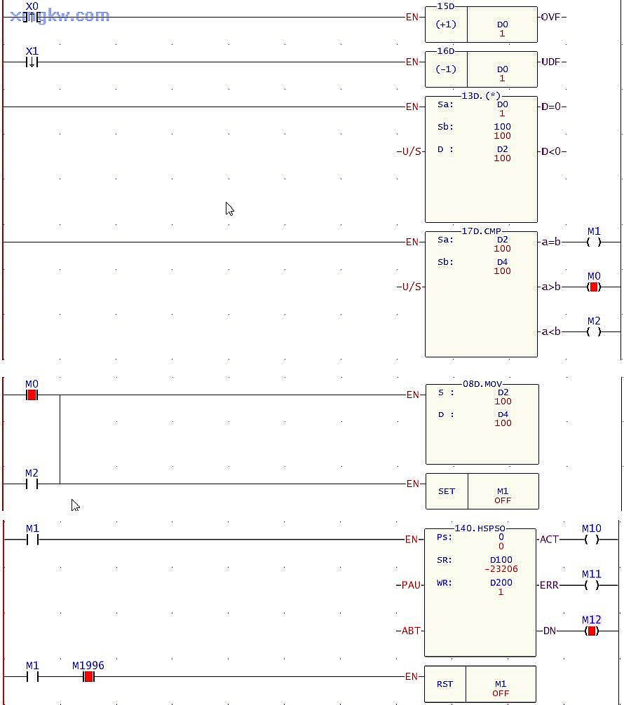 作為絕對定位的目標(biāo)位置值,同時(shí) M1被置位為 On,F(xiàn)un.140指令執(zhí)行,系統(tǒng)從上次位置( D4=100)跑到目標(biāo)位置( D4=D2=200),再次左移 1mm。依此類推,右移的情況與此相似,只要有按下右移寸動(dòng)開關(guān)一次,將右移 1mm。