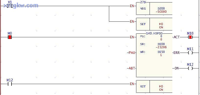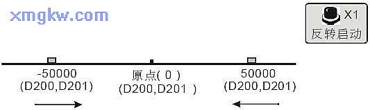 【控制要求】某定位控制系統(tǒng)做左右位移運(yùn)動,每按下一次按鈕( X1),定位裝置從當(dāng)前位置反轉(zhuǎn)移動到以原點(diǎn)( D200, D201值為0)為對稱中心的另一邊。