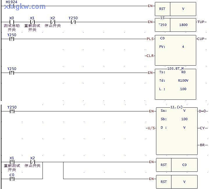 T250的上升沿接點計數(shù)滿 4次以后,整個測試過程結(jié)束。如果需要對待測設(shè)備進行重復測試,只需要將 X1由 OFF→ON動作一次即可。當 X2=ON時,停止測試, PLC不再對待測設(shè)備采集數(shù)據(jù),同時清除計數(shù)器 C0。