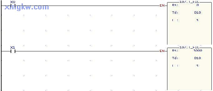 X1=ON時,將 3000傳送到寄存器 D10~D14,5個變頻器的運轉(zhuǎn)頻率為 30Hz。