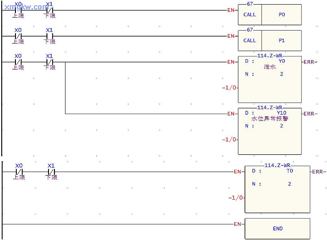 P0和P1子程序中嵌套了 CALL P2子程序,如果進行泄水動作 100秒,但水位上限傳感器仍為 ON,則執(zhí)行P2子程序, Y11線圈導(dǎo)通,機械故障指示燈報警。