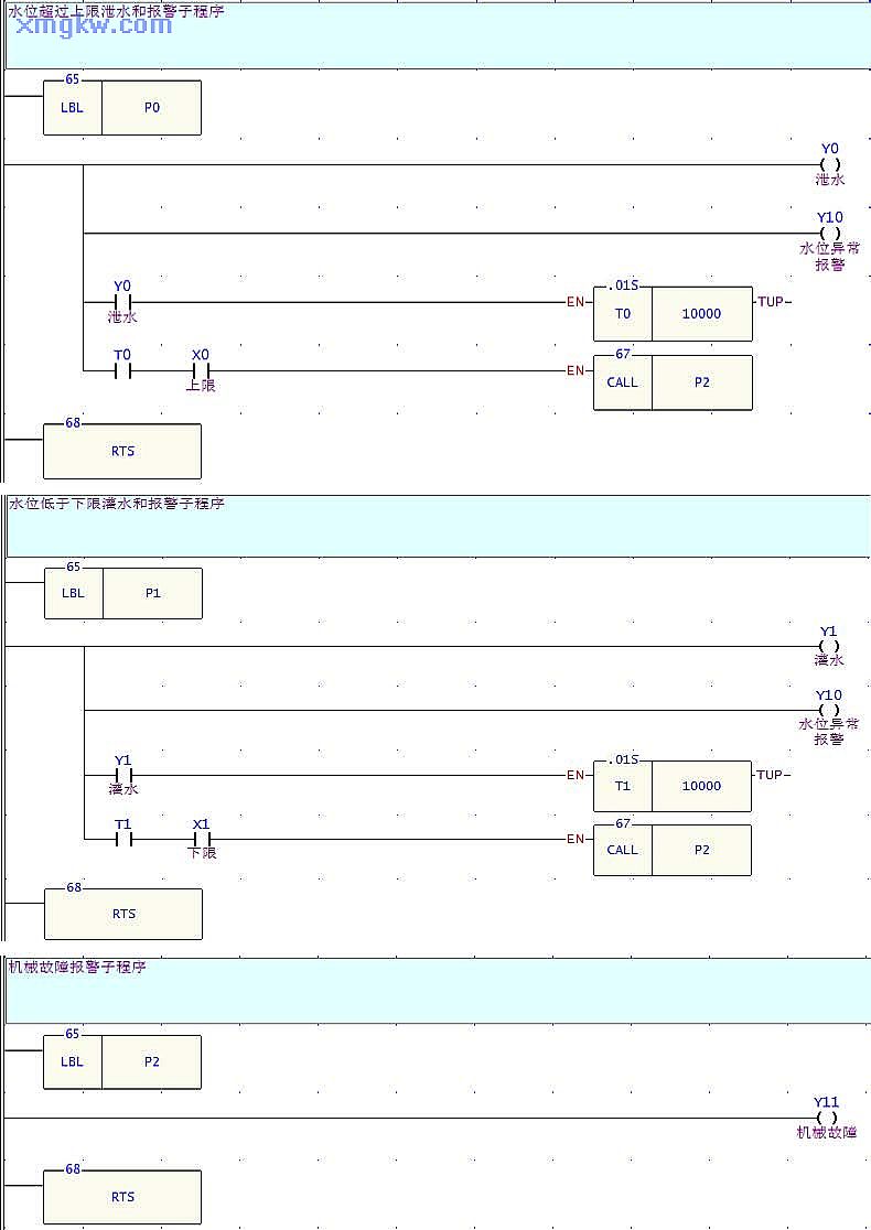 同樣,如果進行灌水動作 100秒,但水位下限傳感器仍為 ON,則執(zhí)行 P2子程序, Y11線圈導(dǎo)通,機械故障指示燈報警。