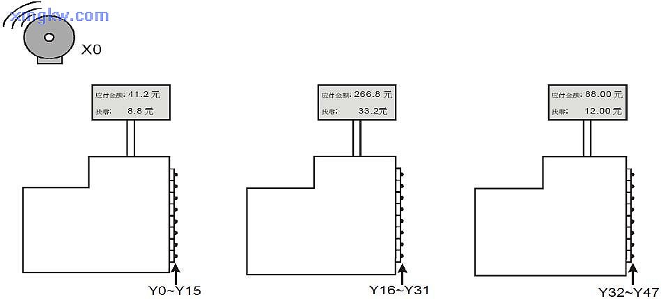 X0=OFF,F(xiàn)OR~NEXT循環(huán)執(zhí)行3次,H0被依次送到 R0~R2中,F(xiàn)OR~NEXT循環(huán)執(zhí)行完畢后,R0~R2的值被送到外部 Y輸出點,所有 Y輸出被復(fù)位為 OFF,每個錢柜抽屜可以打開。
