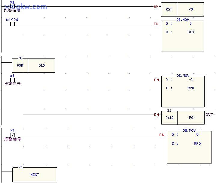 2. P0=0時,RP0代表R0;P0=1時,RP0代表R1;P0=2時,RP0代表R2。當(dāng)警報響時, X0=ON,F(xiàn)OR~NEXT循環(huán)執(zhí)行3次,F(xiàn)FFFH被依次送到 R0~R2中,F(xiàn)OR~NEXT循環(huán)執(zhí)行完畢后, R0~R2的值被送到外部 Y輸出點,所有 Y輸出被置位為 ON,將每個錢柜抽屜鎖住。