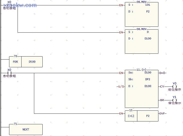當(dāng)相加結(jié)果數(shù)值小于 -32768時(shí),BR接通,輸出線圈Y1導(dǎo)通,借位指示燈亮;當(dāng)相加結(jié)果數(shù)值大于 32767時(shí),CY接通,輸出線圈 Y0導(dǎo)通,進(jìn)位指示燈亮。