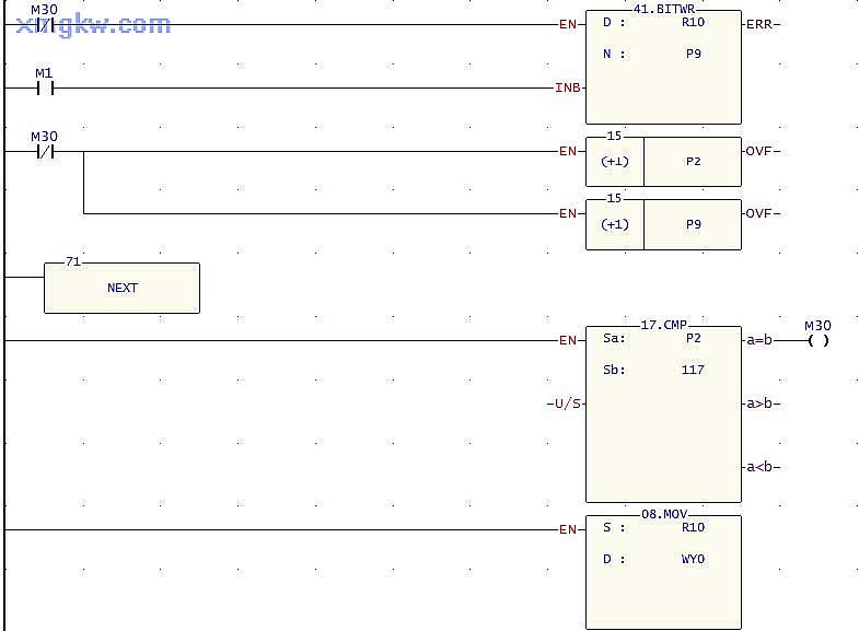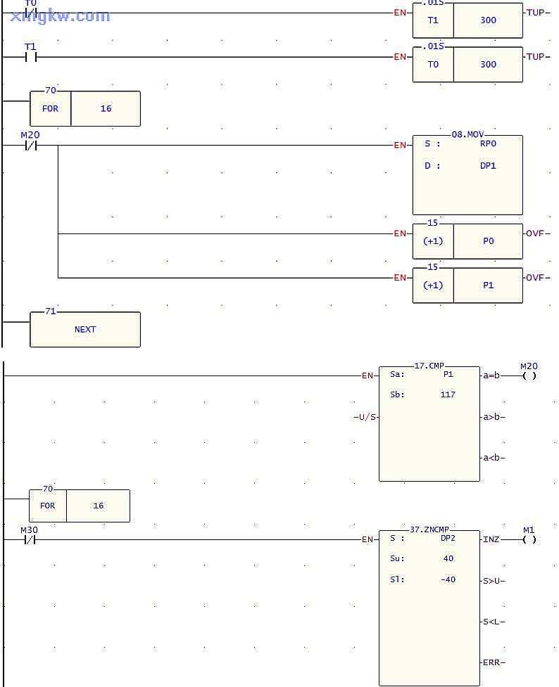 【控制要求】 FBS-40MA + FBs-TC16,偵測(cè)外部 16路溫度 , 每隔3秒將新溫度數(shù)據(jù)放入 D101-D116;當(dāng)溫度超過 40℃或小于- 40℃時(shí),正常指示燈滅。