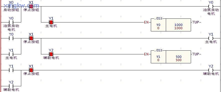 【控制需求】啟動(dòng)按鈕 X0被按下,油泵電動(dòng)機(jī)立即啟動(dòng),延時(shí) 10秒后主電動(dòng)機(jī)啟動(dòng),再延時(shí) 5秒后輔助電動(dòng)機(jī)啟動(dòng);按下停止按鈕,所有電機(jī)立刻停止運(yùn)行。
