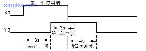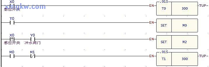 當(dāng)檢測到有人進(jìn)入時,紅外線傳感器 X0=ON,T0得電開始計(jì)時。若在 3秒內(nèi)人離開( X0=OFF), T0失電,不執(zhí)行任何動作。若人站滿 3秒,則 T0的常開接點(diǎn)閉合,保持 M0=ON,開始第一次沖水(Y0=ON)。