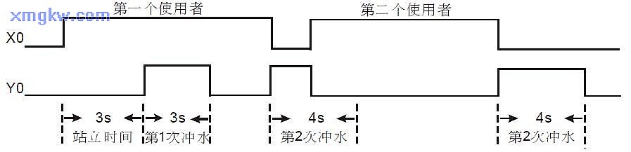 M1形成了一個自保電路。當(dāng)使用者站立時間超過 3秒才離開(常開接點(diǎn) M0=ON、常閉接點(diǎn) X0=ON)時, M1保持為 ON。開始第二次沖水( Y0=ON),直到?jīng)_水 4秒后( T2的常開接點(diǎn)閉合,常閉接點(diǎn)斷開),停止沖水( Y0=OFF),M0、M1被復(fù)位。