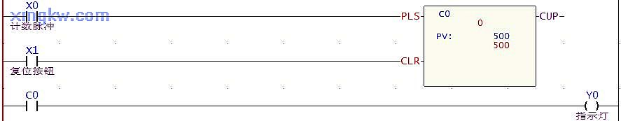 每完成一臺(tái)產(chǎn)品, C0計(jì)數(shù)一次,計(jì)數(shù)到 500次,Y0=ON,目標(biāo)完成指示燈亮。