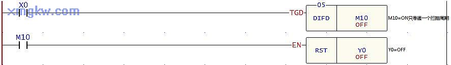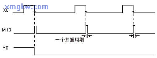 【控制要求】 開關(guān)由 ON→OFF動(dòng)作時(shí)產(chǎn)生一個(gè)掃描周期的脈沖 M10,作為條件去觸發(fā)指示燈或其他裝置。