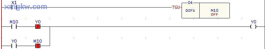 ● 第 1次(單次)按下按鈕:第一次按下按鈕, X1=ON,[DIFU M10]指令被執(zhí)行, M10導(dǎo)通(M10=ON)一個掃描周期,在本次掃描周期內(nèi) M10常開觸點 = ON,Y0常閉觸點 =ON,則 Y0線圈=ON,燈被點亮。在 PLC進(jìn)行下個周期掃描時, M10線圈=OFF,所以 M10常閉觸點 =ON,加上 Y0常開觸點 = ON,所以輸出線圈 Y0還是=ON,并實現(xiàn)自保持回路,燈持續(xù)保持點亮狀態(tài),直到再次按下按鈕。● 第 2次(雙次)按下按鈕:第二次按下按鈕, X1= ON,[DIFU M10]指令被執(zhí)行, M10導(dǎo)通( M10=ON)一個掃描周期。在本次掃描周期內(nèi): M10常閉觸點 =OFF,所以 Y0線圈= OFF,Y0自保持回路斷開,燈被熄滅。在 PLC進(jìn)行下個周期掃描時, M10線圈=OFF,所以 M10常閉觸點 =ON,但 Y0常開觸點 =OFF,所以 Y0線圈= OFF并實現(xiàn)自保持回路,燈持續(xù)保持熄滅狀態(tài),直到再次按下按鈕。● 利用 FUN10.TOGG交替開關(guān)也可實現(xiàn)此功能。