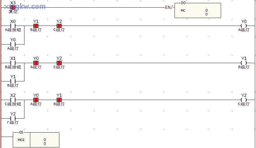 主持人按下復(fù)位按鈕后, X3信號(hào)狀態(tài)為 ON,那么 X3常閉觸點(diǎn) =OFF,則[MC N0]指令被執(zhí)行, MC0~MCE0之間程序不被執(zhí)行。 Y0、Y1、Y2全部失電,所有組的指示燈熄滅。主持人松開(kāi)按鈕后, X3=OFF,MC0~MCE0之間程序又正常執(zhí)行,進(jìn)入新一輪的搶答。