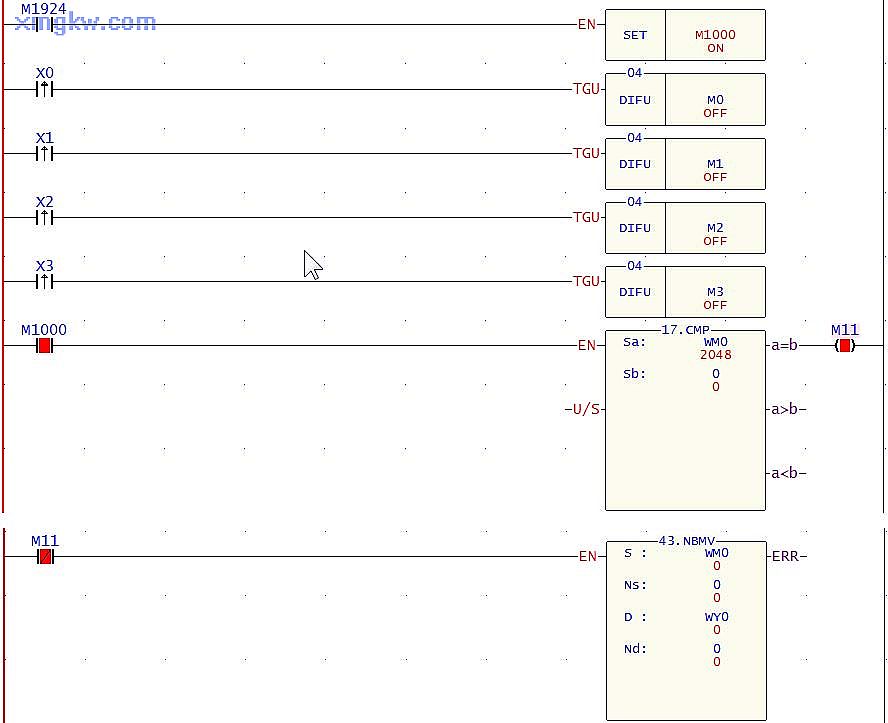 - 按下任何按鈕后,對(duì)應(yīng)的 X輸入信號(hào)點(diǎn)將由 OFF→ON變化一次,在這個(gè)掃描周期里, DIFU指令被執(zhí)行,對(duì)應(yīng)的一個(gè) M輔助繼電器接通一個(gè)掃描周期,則 WM0>0,CMP指令執(zhí)行后的結(jié)果使得 M11=OFF, M11的常閉觸點(diǎn)導(dǎo)通, [NBMV]指令被執(zhí)行, M 裝置的狀態(tài)將被傳送到外部相應(yīng)的一個(gè)輸出點(diǎn)上,同時(shí)原來點(diǎn)亮狀態(tài)的指示燈將熄滅。